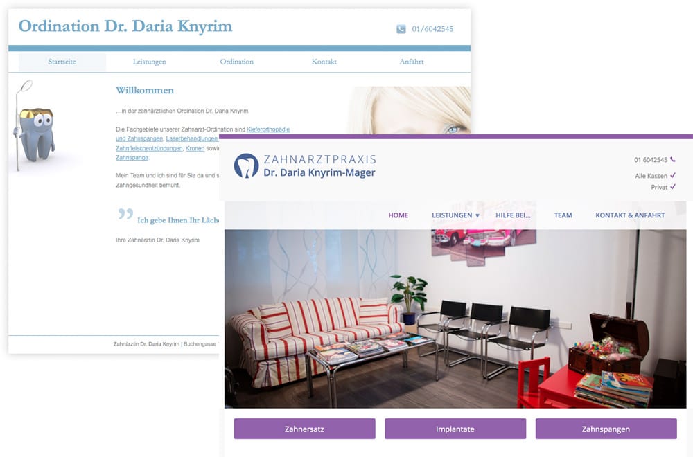 seit der neuen Homepage und der Suchmaschinenoptimierung ist meine Ordination im Internet sofort zu finden. Es kommen nun viele Patienten, die sich im Internet informiert haben und dort einen Zahnarzt suchen. Vielen Dank für Ihre wertvolle Unterstützung,Dr. Daria Knyrim